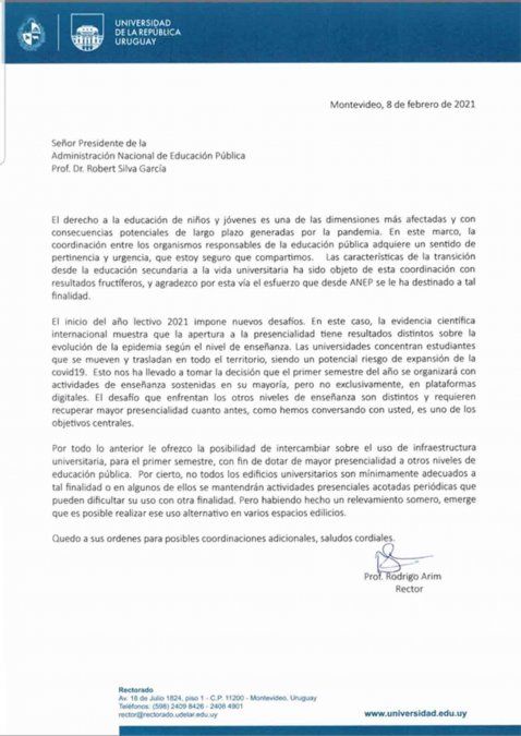 El rector de la Universidad de la República (Udelar), Rodrigo Arim, ofreció las instalaciones de la Universidad a la Administración Nacional de Educación Pública (ANEP) para aumentar la presencialidad en el comienzo de clases.