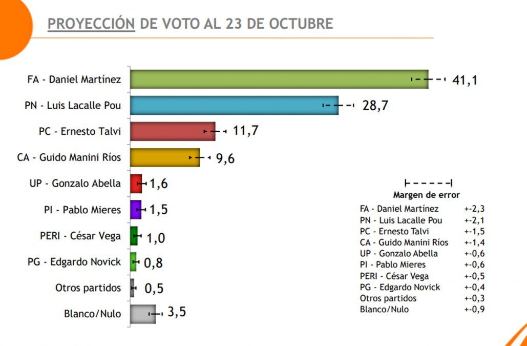 Frente Amplio 41.1%, Partido Nacional 28.7%, Partido Colorado 11.7% y Cabildo Abierto 9.6%.