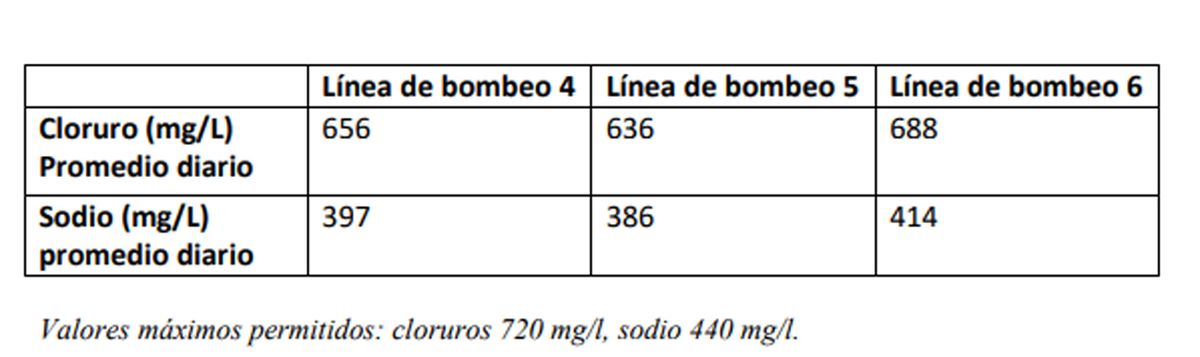 En la cuarta línea de bombeo se registró un promedio de 728 mg/l de cloro, según el informe de este sábado; 682 mg/l en la quinta línea de bombeo; y 753 mg/l en la sexta línea. Dos de tres referencias están por encima de lo permitido.