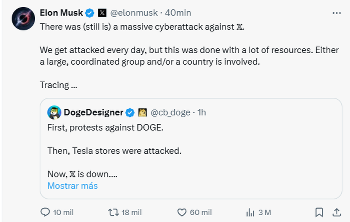El millonario hizo esa afirmación replicando una publicación de otro usuario (DogeDesigner) que sugiere que la caída de X este lunes puede estar relacionada con las protestas recientes contra el Departamento de Eficiencia Gubernamental de Estados Unidos (DOGE, dirigido por Musk) y actos de vandalismo contra tiendas del fabricante de autos eléctricos Tesla, también de su propiedad.