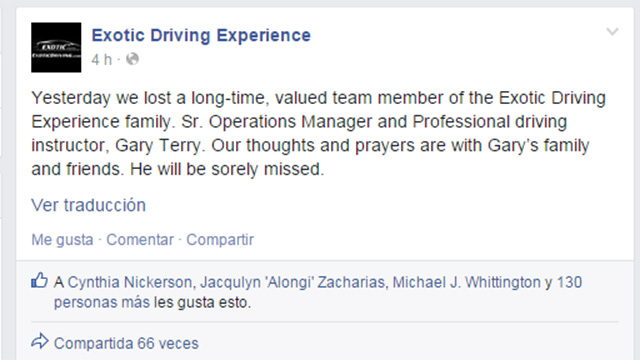 Estaba en el asiento del copiloto de un Lamborghini en el circuito "Exotic Driving Experience", del cual era el gerente de operaciones.