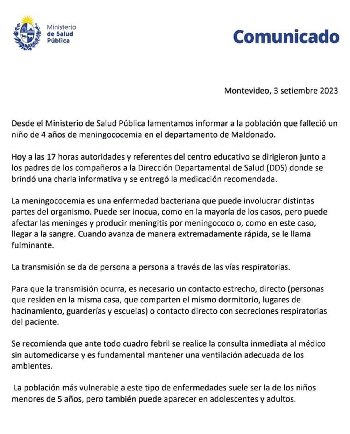 Un niño de 4 años falleció en las últimas por un cuadro de meningitis meningocócica en Maldonado.