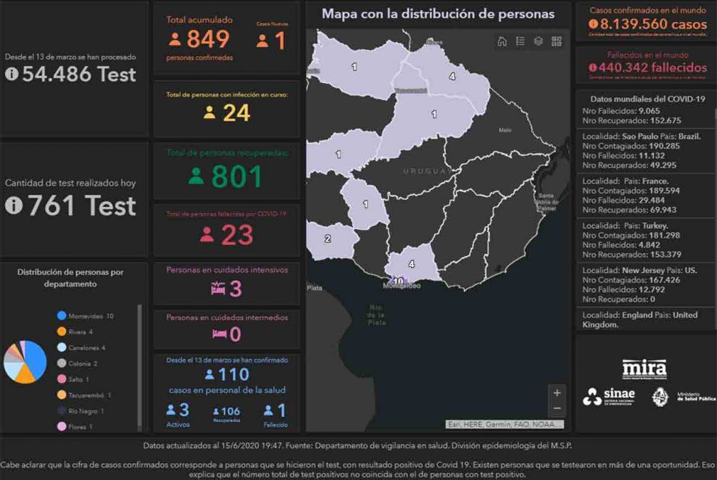 En esta jornada se procesaron 761 analísis. En tanto, los departamentos con casos activos hasta el momento son: Canelones, Colonia, Flores, Montevideo, Río Negro, Rivera, Salto y Tacuarembó.