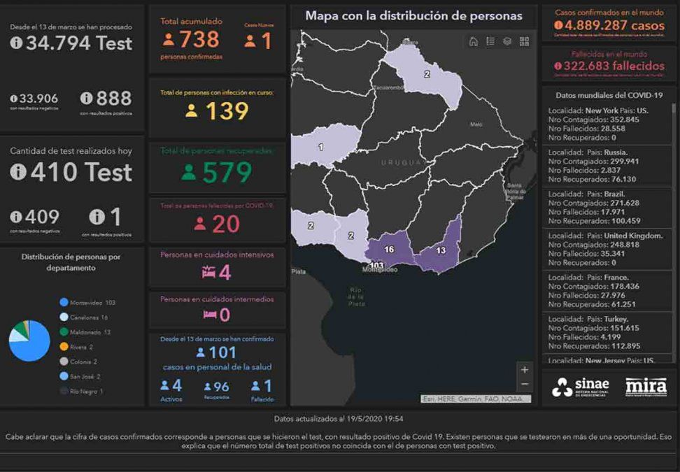 Uruguay sumó este martes 19 de mayo un nuevo caso de coronavirus, lo que da una cifra total de 738 casos positivos confirmados de Covid-19 en el territorio desde que se decretó la emergencia sanitaria el 13 de marzo. Del total de casos, 579 ya se recuperaron y 20 personas fallecieron.