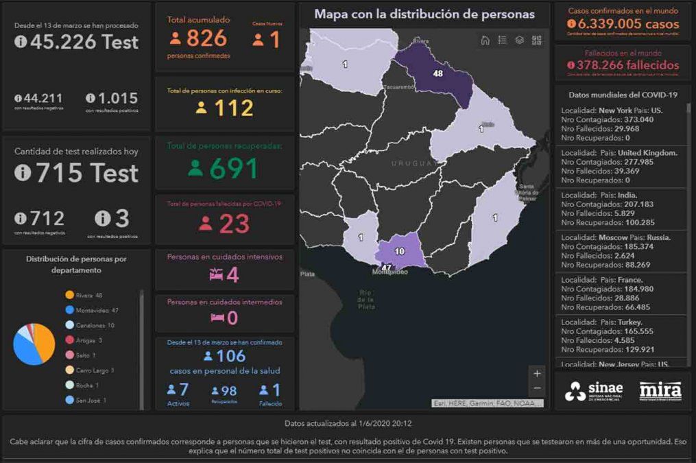 Uruguay sumó esta jornada un nuevo caso de coronavirus COVID-29, lo que da una cifra de 826 casos positivos acumulados en todo el territorio desde que comenzó la emergencia sanitaria en marzo. De este total, 691 ya re recuperaron y 23 pacientes fallecieron. El nuevo caso se registró en el departamento de Rocha.
