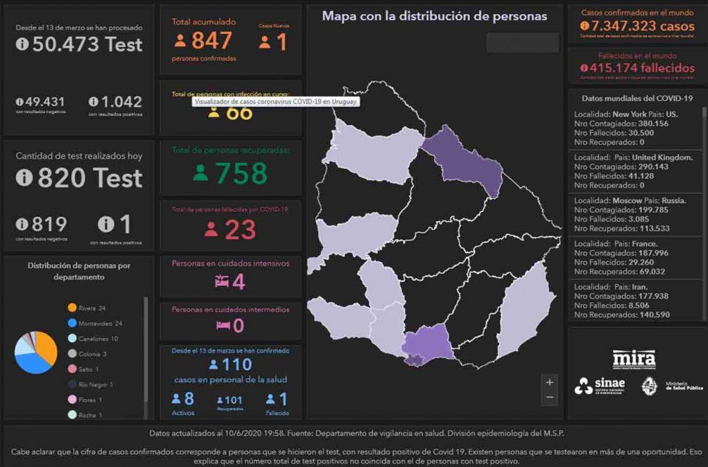Uruguay sumó este miércoles un nuevo caso de coronavirus en el territorio, lo que da una cifra total de 847 casos positivos acumulados desde que comenzó la emergencia sanitaria en marzo. Del total, 758 ya se recuperaron y 23 pacientes fallecieron.