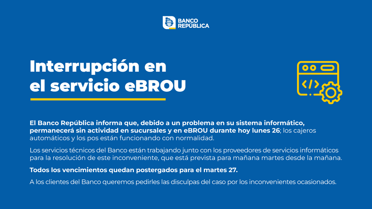 El Banco República (BROU) informó que, debido a un problema en su sistema informático, permanecerá sin actividad en sucursales y en eBROU durante este lunes 26 de setiembre.