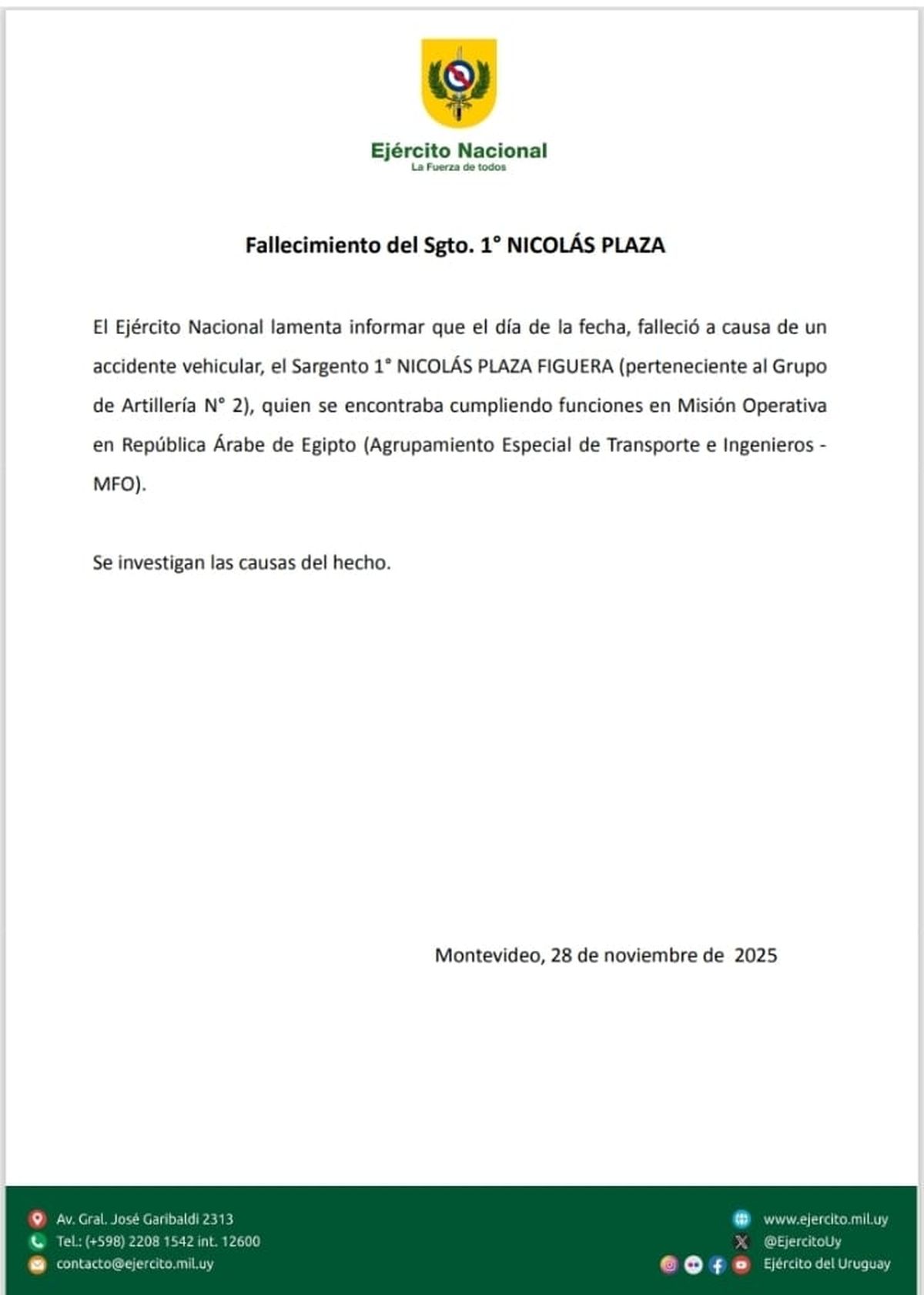 El sargento Nicolás Plaza Figuera del Grupo de Artillería Nº2 falleció a causa de un accidente vehicular en Egipto, informó este viernes el Ejército Nacional.