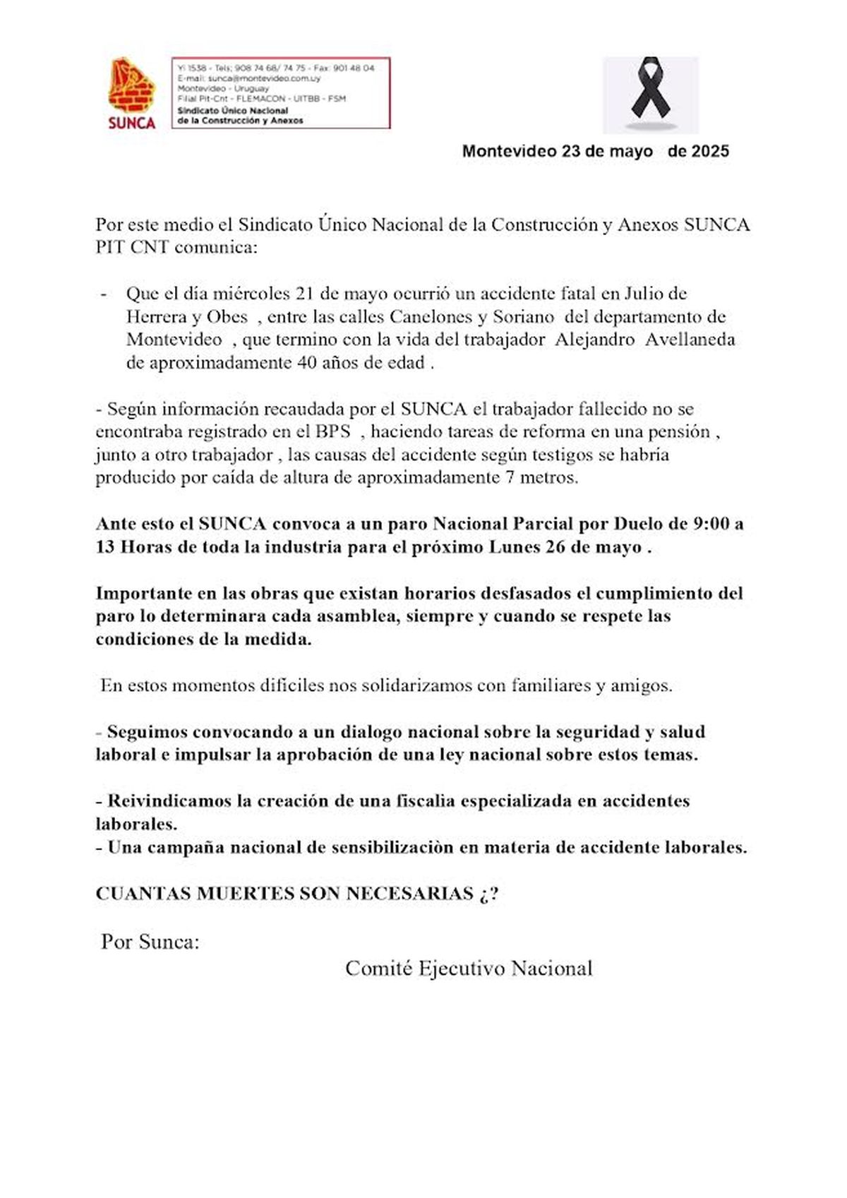El SUNCA convoca a un paro nacional parcial en toda la industria para este lunes 26 de mayo de 9:00 a 13:00 debido a la muerte de un trabajador.