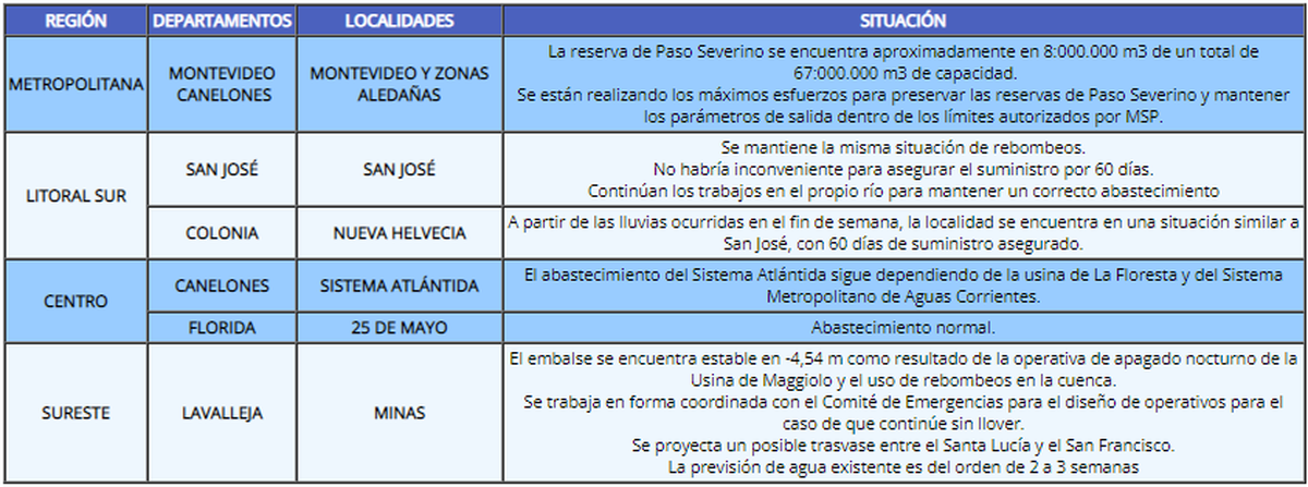 En Minas, donde la situación es crítica, el comunicado indica que "se trabaja en forma coordinada con el Comité de Emergencias para el diseño de operativos para el caso de que continúe sin llover". Allí, se apaga la operativa en la noche en la Usina Maggiolo y se continúa con rebombeo, y la previsión no supera las tres semanas.