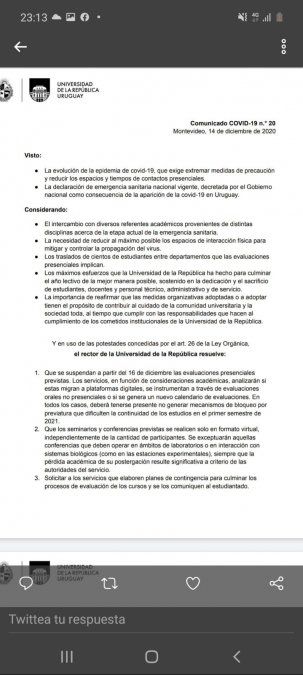 La Universidad de la República (Udelar) resolvió suspender desde este 16 de diciembre la toma de exámenes y evaluaciones presenciales. Todas estas actividades serán objeto de análisis a raíz del aumento de casos de coronavirus.