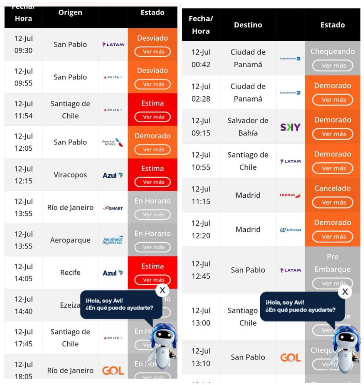 La afectación comenzó en la noche del viernes y continuaba hasta este sábado a mediodía. En la web del aeropuerto el visualizador indica la situación de cada uno de los vuelos internacionales que estaban previstos, tanto en arribos como en partidas. En la tarde del sábado, los vuelos comenzaron a regularizarse, según el visualizador.