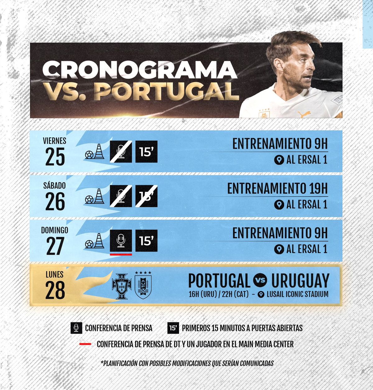 El partido ante Portugal va el lunes 28 a la hora 22 de Qatar (16 de Uruguay).