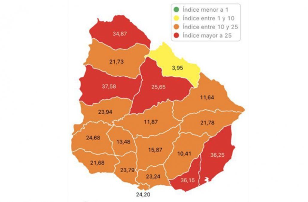 Otros cinco departamentos permanecen en rojo: Tacuarembó (25,65), Artigas (34,87), Maldonado (36,15), Rocha (36,25) y Paysandú, con la peor situación sanitaria del país, con 37,58.