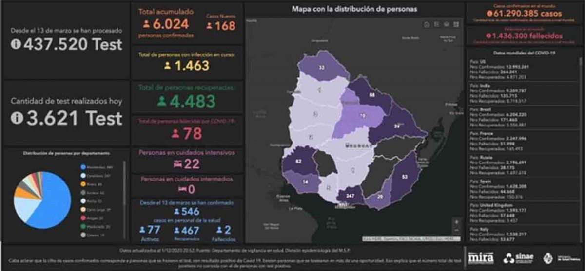 Uruguay registró este martes 168 casos nuevos de Coronavirus Covid-19, en una base de 3.621 análisis procesados, lo que da una cifra de 6.024 casos positivos acumulados desde que comenzó la emergencia sanitaria en marzo.