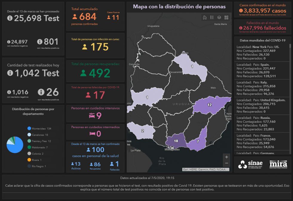 Uruguay sumó este jueves 7 de mayo 11 nuevos casos de coronavirus COVID-19, lo que da una cifra total de 684 casos desde que comenzó la emergencia sanitaria el 13 de marzo. De ese total, 492 personas ya se recuperaron y 17 fallecieron.