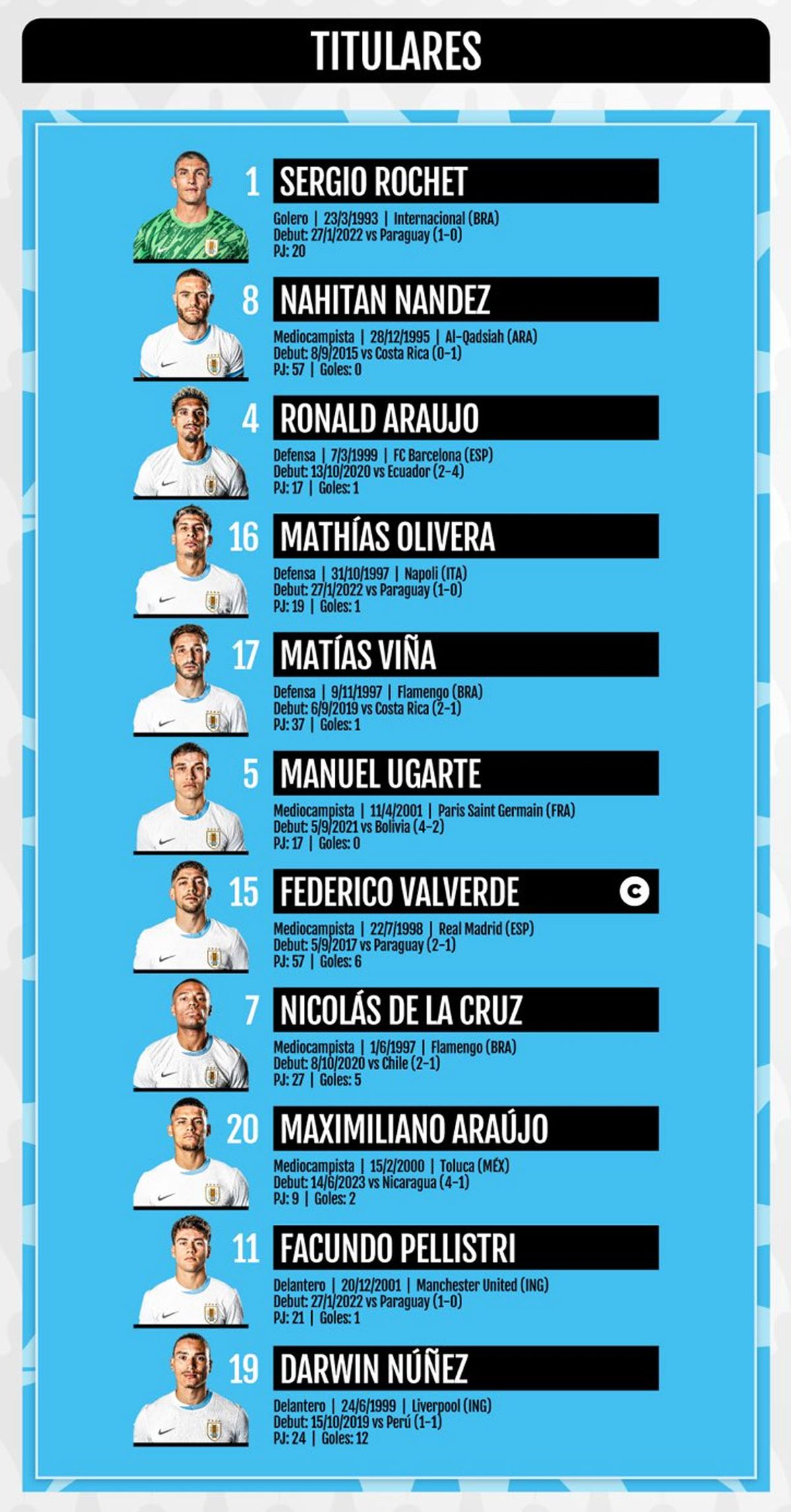 Los once jugadores serán: Sergio Rochet, Nahitan Nández, Ronald Araújo, Mathías Olivera, Matías Viña, Manuel Ugarte, Federico Valverde, Nicolás de la Cruz, Maximiliano Araújo, Facundo Pellistri y Darwin Núñez.