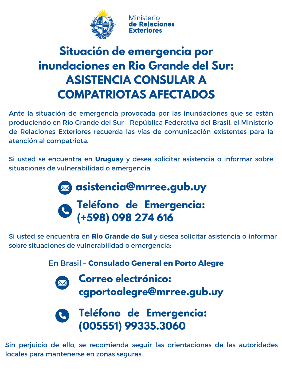 Respecto a los dos uruguayos que denunciaron en Subrayado haber quedado varados por las inundaciones, la Cancillería asegura que se comunicaron con el Consulado de Porto Alegre el 6 de mayo. Desde entonces, se mantienen en contacto permanente con las autoridades y hasta el momento no han solicitado ser repatriados.