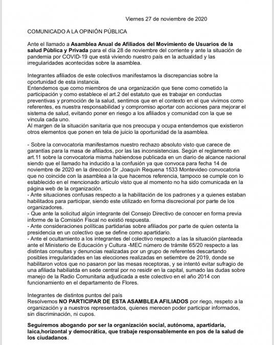 En tanto, un grupo de afiliados de la Movimiento de Usuarios de la salud Pública y Privada emitió un comunicado la semana pasada en el que rechazaron por falta de garantías la realización de la asamblea. Según supo Subrayado por allegados a Pereyra, hay usuarios dispuestos a denunciar las condiciones en que se realizó por considerar que es ilegítima.