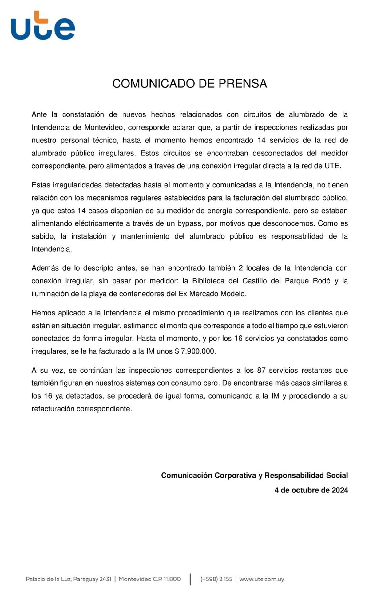 UTE publicó este viernes 4 de octubre un comunicado en el que informa que detectó 16 conexiones irregulares de la Intendencia de Montevideo: “14 servicios de la red de alumbrado público irregulares” y “2 locales de la Intendencia con conexión irregular”.