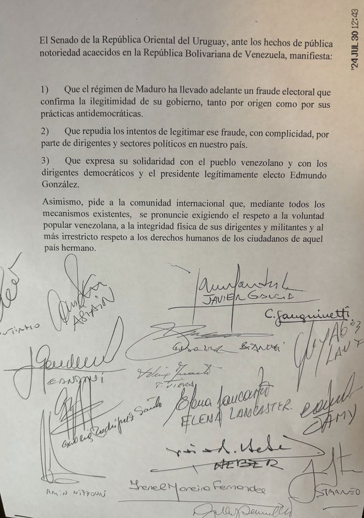 El senador Javier García, que solicitó la sesión extraordinaria del Senado, le reclamó a los senadores del Frente Amplio (FA) “un poco de dignidad” y “pararse ante el dictador Maduro”. “Les pido a los senadores del Frente Amplio un poco de dignidad, que tengan la dignidad de defender las instituciones democráticas”, insistió García elevando la voz sobre el final de su intervención, lo que generó el rechazo de la bancada del FA, que reaccionó con gritos hacia el legislador del Partido Nacional.