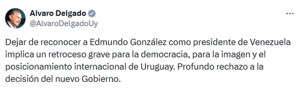 "Dejar de reconocer a Edmundo González como presidente de Venezuela implica un retroceso grave para la democracia, para la imagen y el posicionamiento internacional de Uruguay. Profundo rechazo a la decisión del nuevo Gobierno", dijo el senador blanco Álvaro Delgado en X.
