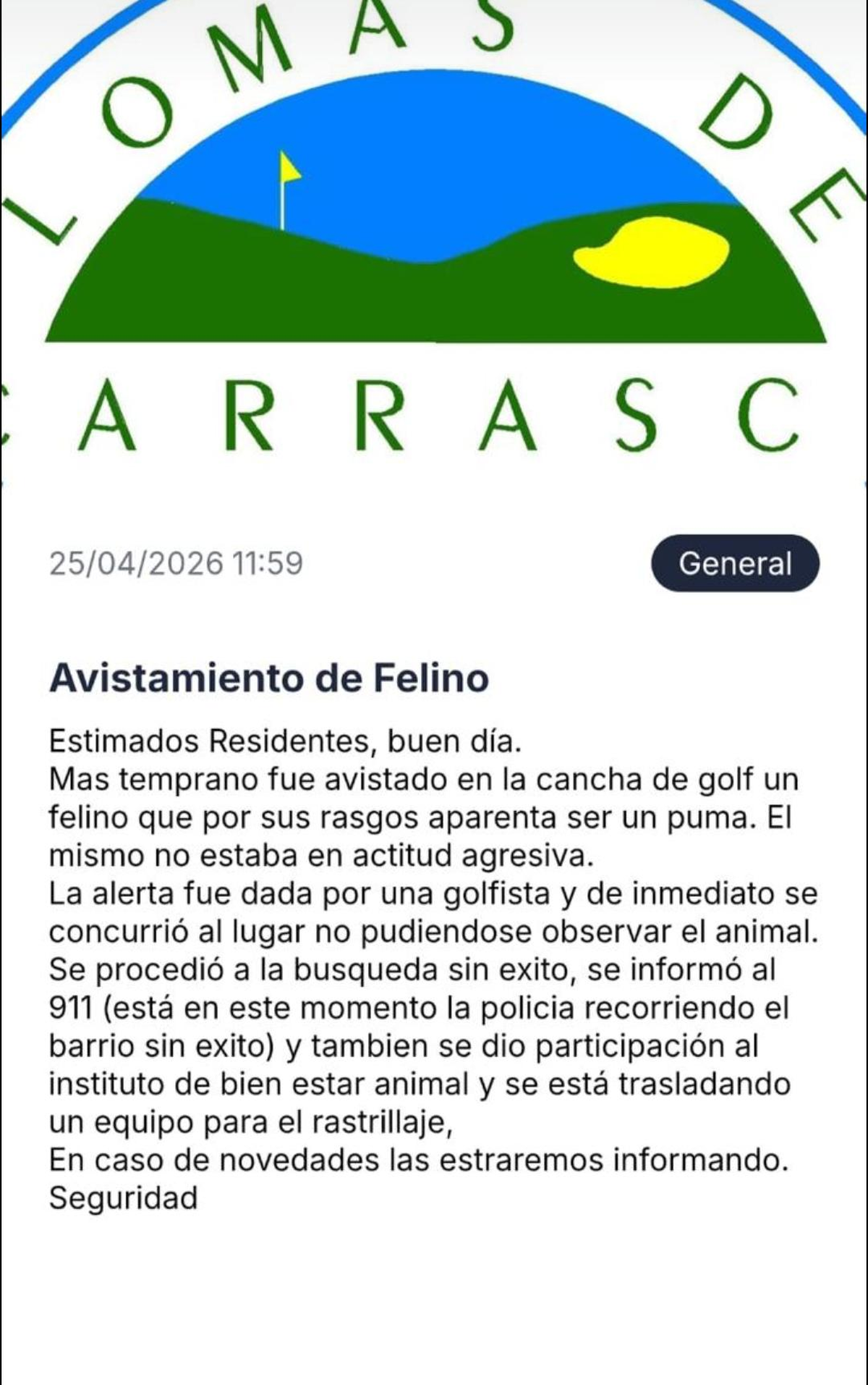 De inmediato se dio aviso a las autoridades, y Subrayado pudo confirmar con la directora de Bienestar Animal de la Intendencia de Canelones, Eugenia Perdomo, que salieron a buscar al puma tras recibir el video esta mañana.