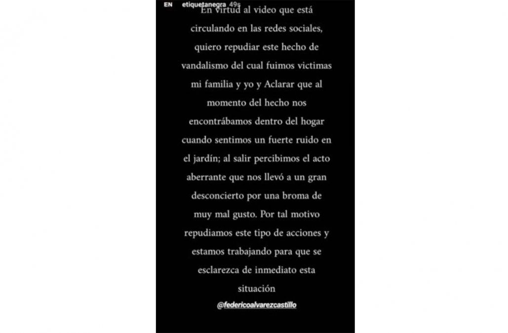 En su cuenta de Instagram, el empresario argentino se refirió a lo ocurrido. “En virtud al video que está circulando en las redes sociales, quiero repudiar este hecho de vandalismo del cual fuimos víctimas mi familia y yo. Aclarar que al momento del hecho nos encontrábamos dentro del hogar cuando sentimos un fuerte ruido en el jardín. Al salir percibimos el acto aberrante que nos llevó a un gran desconcierto por una broma de muy mal gusto. Por tal motivo repudiamos este tipo de acciones y estamos trabajando para que se esclarezca de inmediato esta situación”, publicó.