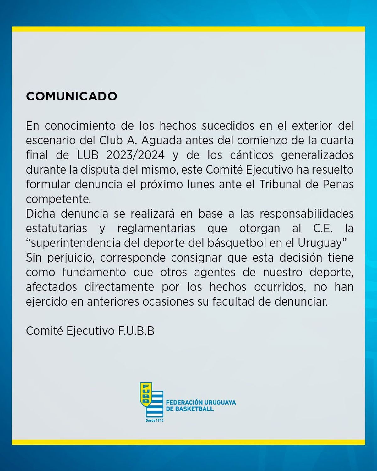 En particular anuncia que el lunes próximo denunciará ante el Tribunal de Penas “los hechos sucedidos en el exterior del escenario del Club Aguada antes del comienzo de la cuarta final de la liga 2023/2024”, dice el comunicado publicado este sábado de tarde, en referencia al partido del viernes.