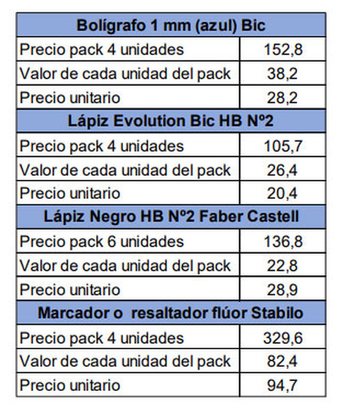 “Teniendo en cuenta productos que se venden de manera unitaria y también por pack de varias unidades, no siempre es más barato el producto en pack. Por ejemplo: el precio promedio de un bolígrafo Bic es $28.2, y de un lápiz negro Bic es $20.4, y los packs presentes de los mismos productos cuentan con los siguientes precios promedios: 4 bolígrafos Bic $152.8, y 4 lápices negro Bic $105.7”, dice el informe.