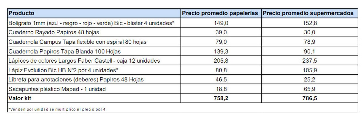 A continuación, se presenta un cuadro comparativo entre papelerías y supermercados de los precios de un kit básico de inicio de clases: