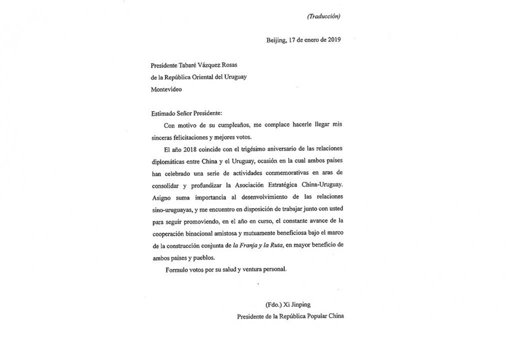 “Asigno suma importancia al desenvolvimiento de las relaciones sino-uruguayas, y me encuentro en disposición de trabajar junto con usted para seguir promoviendo, en el año en curso, el constante avance de la cooperación binacional amistosa y mutuamente beneficiosa bajo el marco de la construcción conjunta de la Franja y la Ruta, en mayor beneficio de ambos países y pueblos”, afirma el líder chino en la misiva.